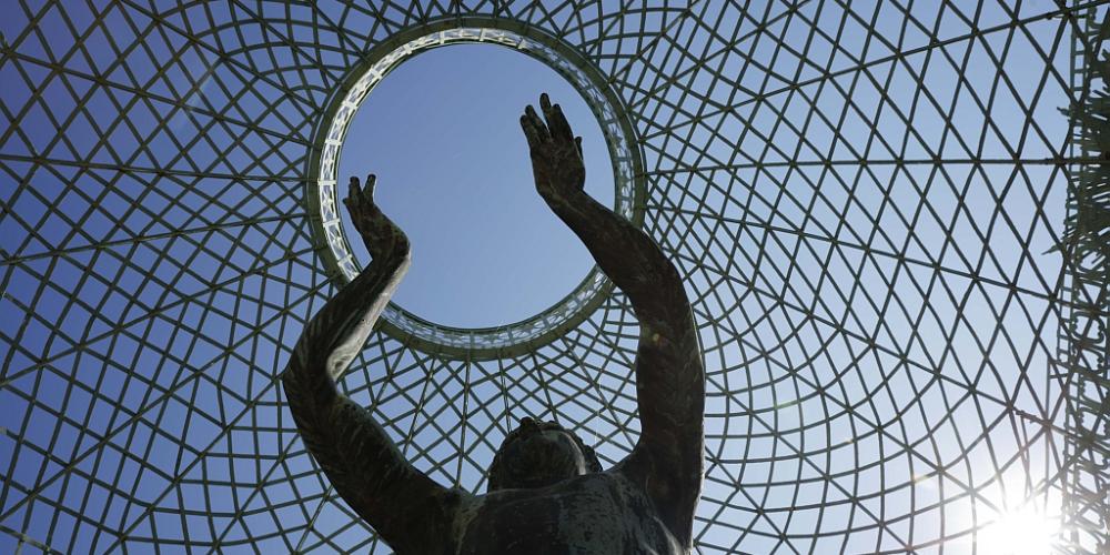 In contrast with the playful design of the garden façade, the north façade is majestic and commanding. A double row of eighty-eight Corinthian columns forms two colonnades in quarter-circle segments enclosing a semicircular cour d'honneur. The Ruins Hill is aligned with this axis to the north. - © A. Stiebitz / SPSG